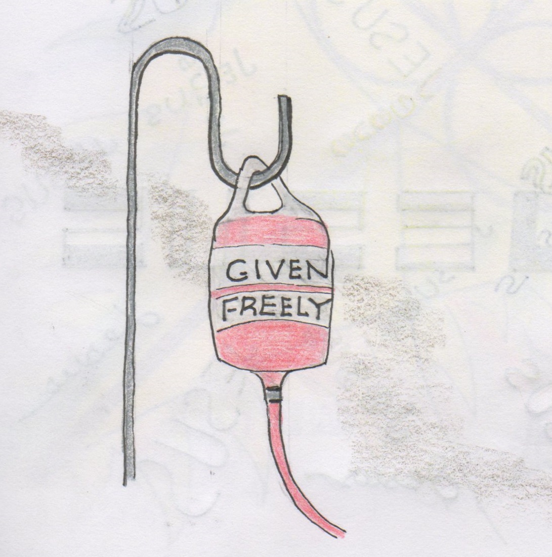The Scene: The container of blood hanging from its holder representing the blood of Jesus, that He gave freely for us.He came, died on the cross, that we might be free from sin and gain eternal life.