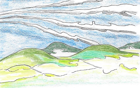 The Scene: A pastoral scene of green and rolling hills– engulfing the hills is a white mist/fog that represents transgressions against the Lord by His people. But, Jesus, through His Holy Spirit, reminds us that He, the great I AM, can blot out our sins for His own sake and remember them no more.