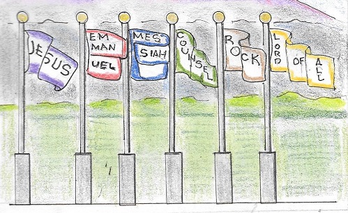 The scene: An array of flags displaying a few of the names ascribed to the King of Kings, our Lord and Savior, Jesus the Christ of Nazareth, Son of God Almighty. All the names given are intended to give the Lord Jesus the glory, honor and majesty due Him as the Second Person of the Holy Trinity: the Godhead: Father, Son, Holy Spirit.