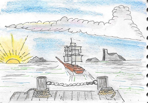 The Scene: The tall-masted ship sailed away from the dock, heading out to sea– the dock represents the world order and the sea ahead is a symbol of the Christian’s journey through life.
