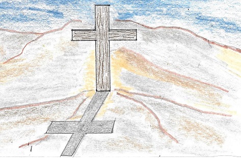 The Scene: The cross of Christ represented–with the shadow of the cross symbolic of the tablets of the law as brought down from the mountain, by Moses.