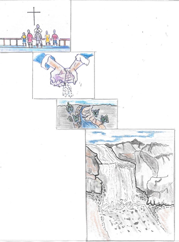 The Scene: The setting (beginning top left picture) is an elder of the church anointing the people with a vial of oil for their healing, Following the pictures down the page, left to right, is seen a pair of hands, showing a progression. The oil is increasing in amount and flowing out of the elder’s hands, representing the power of God growing in strength, through corporate prayer, as the elder and the people who are present pray to our Heavenly Father. The drop of oil representing living water (God’s Word) began to form and flow in a small finger stream as more and more people were anointed and their prayers were added to the previous peoples’ prayers. All along the path of the stream of living water, green growth appeared indicating the life (spiritual awakening) being created. The stream continued to grow into a river as the church members fell to their knees in prayer. As the last person was anointed with oil for healing, a strong flowing waterfall appeared, indicating the mighty power God has given to his people through corporate prayer (living water, hydropower of God) poured forth.