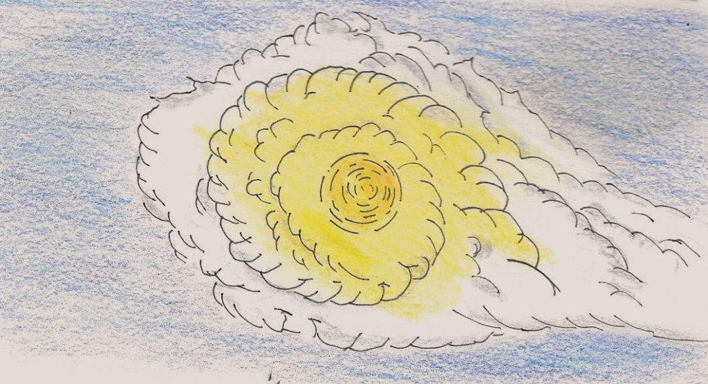 The Scene: Swirling clouds and bright sun shining through the cloud indicating the coming of the Lord Jesus, as He promised during His earthly ministry.