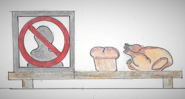The Scene: A crossed out idol sitting on a table, with a loaf of bread and a baked chicken sitting next to the idol–representing God’s provision for His creation (people).