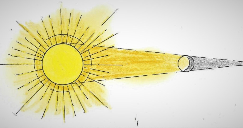 The Scene: A sequence: A scene of the sun and moon seen at the same time from afar– the light of the sun striking the moon, observed sunrise to sunset and the back side of the moon in darkness.