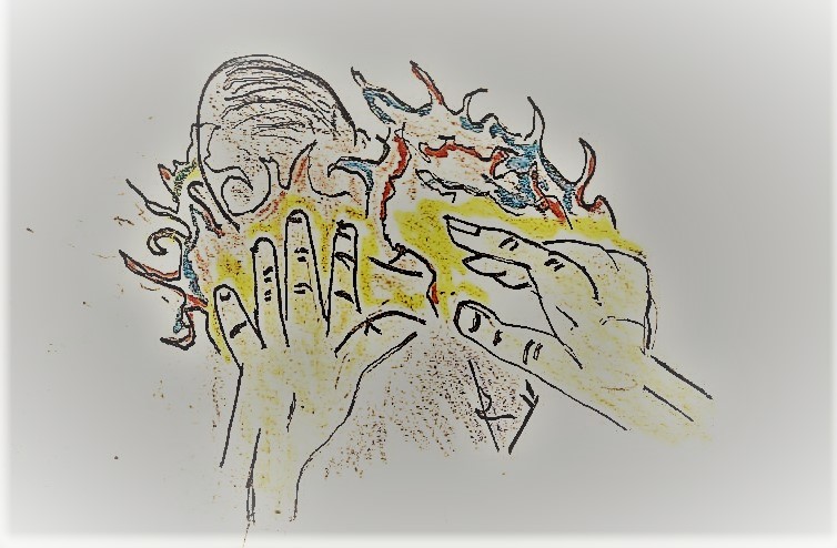 The Scene: A person who has already received the baptism in the Holy Spirit, laying hands on someone who wants to receive the same baptism in the Holy Spirit. The flames (tongues of fire) represent the Holy Spirit entering the candidate.